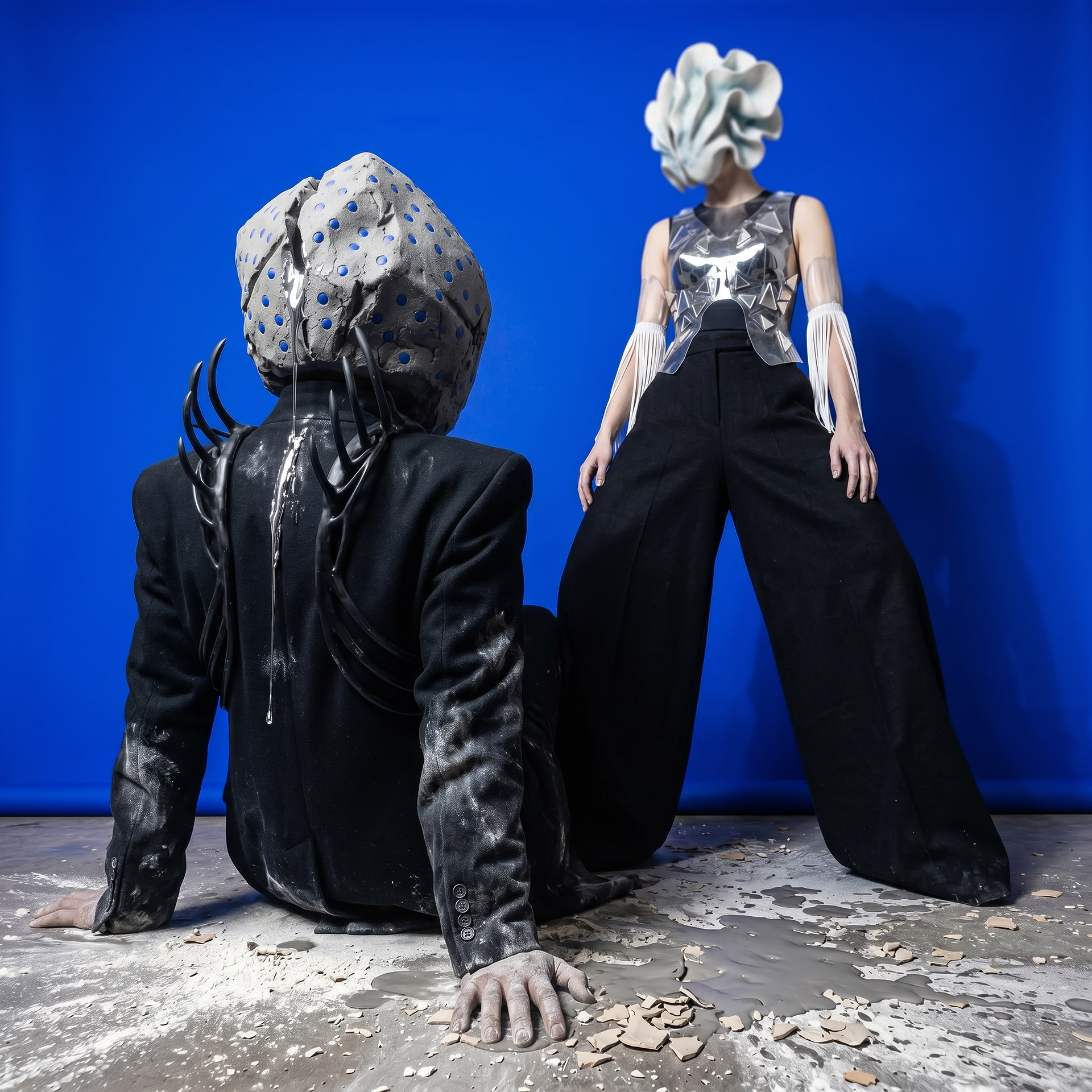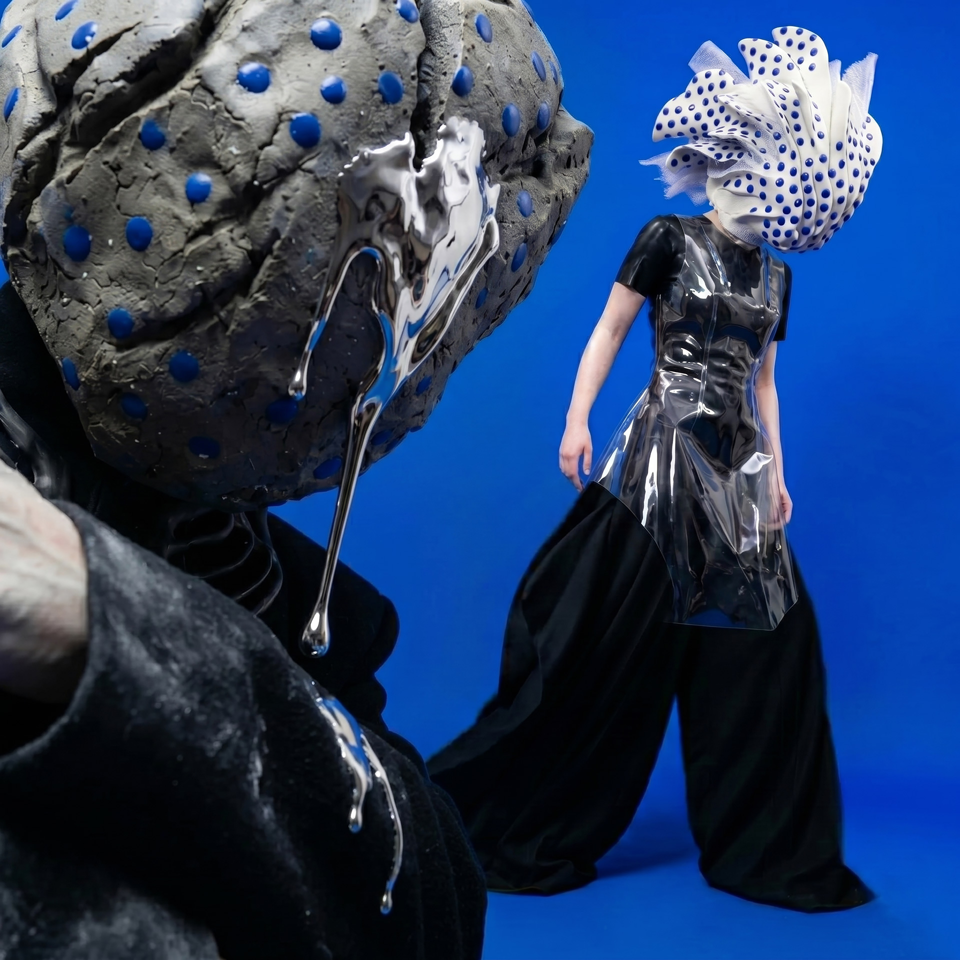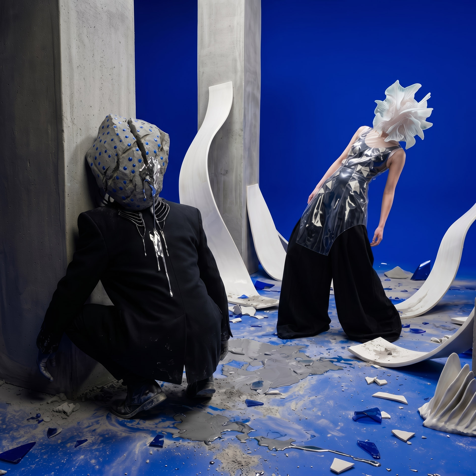 The Shell advances as an architecture of fractured porcelain, an exoskeleton protecting the void. In her shadow, Monolith Boy embodies absolute weight: a stone totem exhaling mercury, leaving a trail of heavy metal across the damp cement.