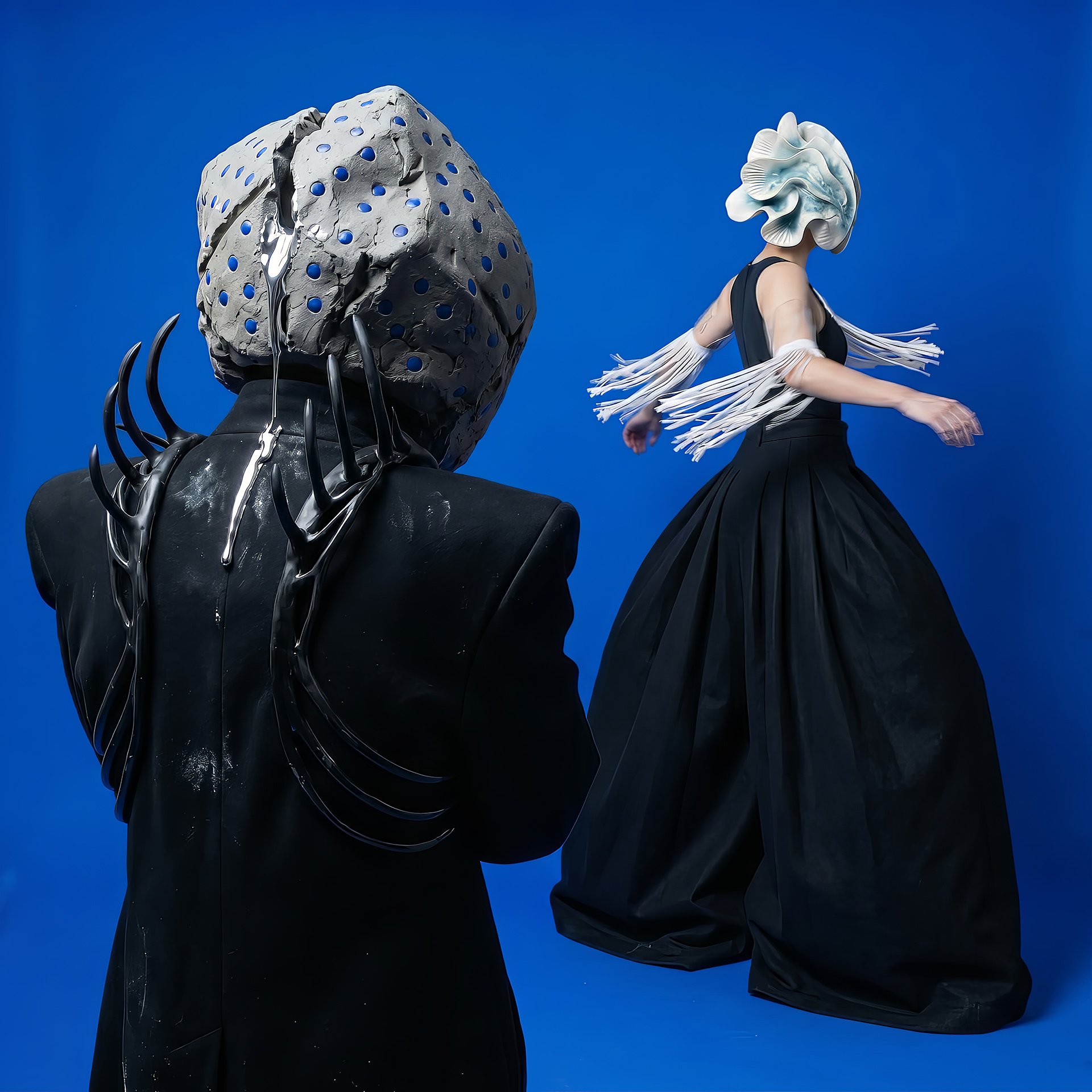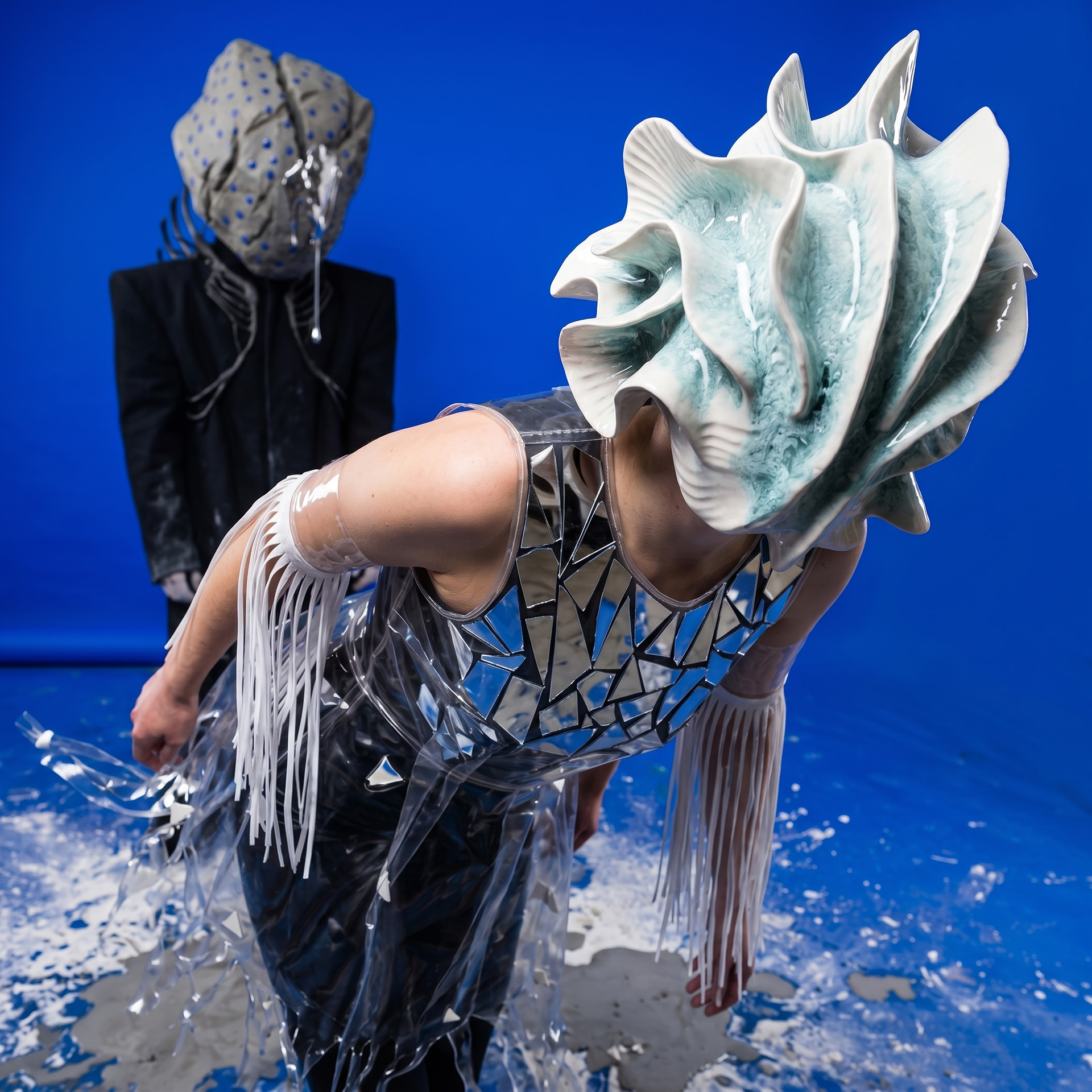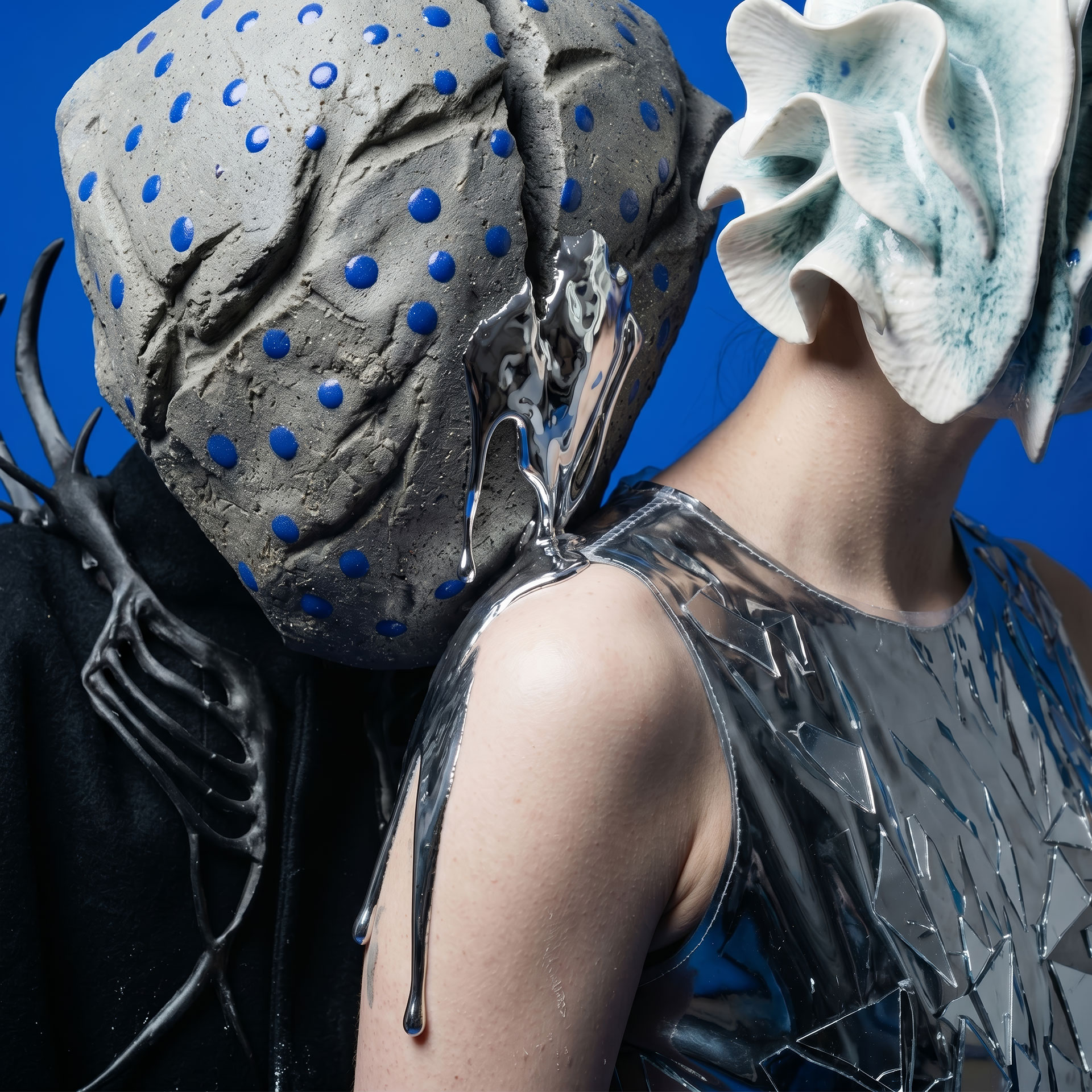 The Shell advances as an architecture of fractured porcelain, an exoskeleton protecting the void. In her shadow, Monolith Boy embodies absolute weight: a stone totem exhaling mercury, leaving a trail of heavy metal across the damp cement.