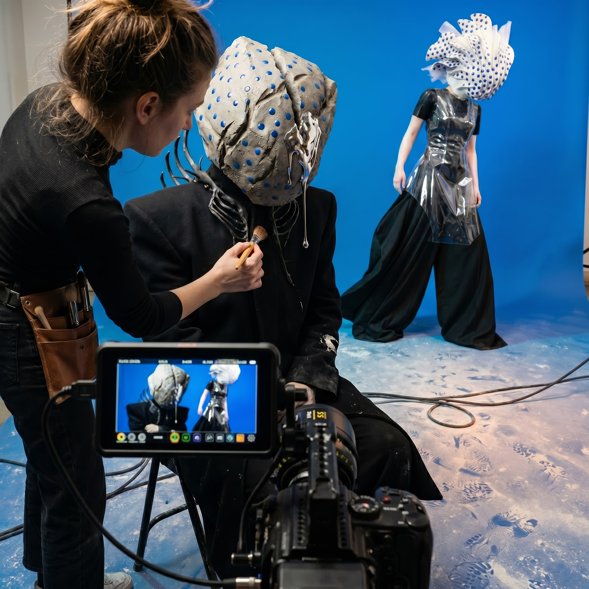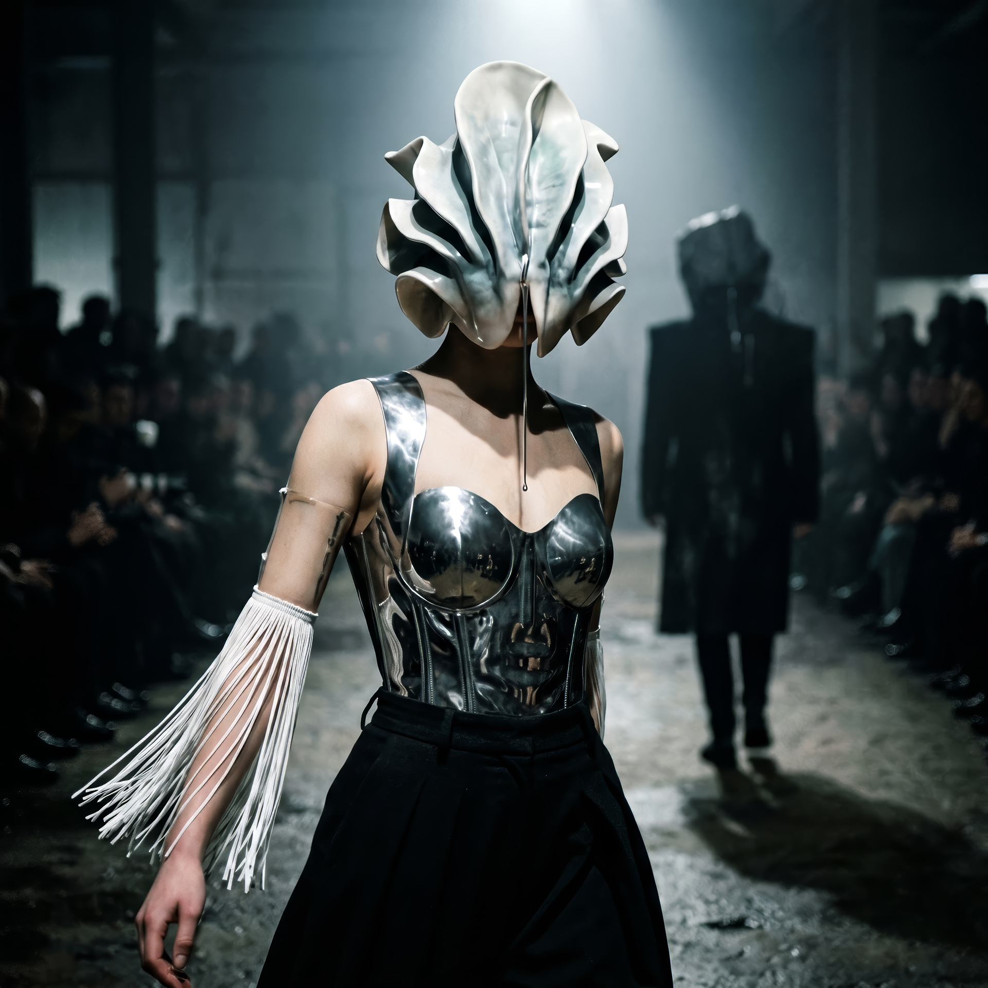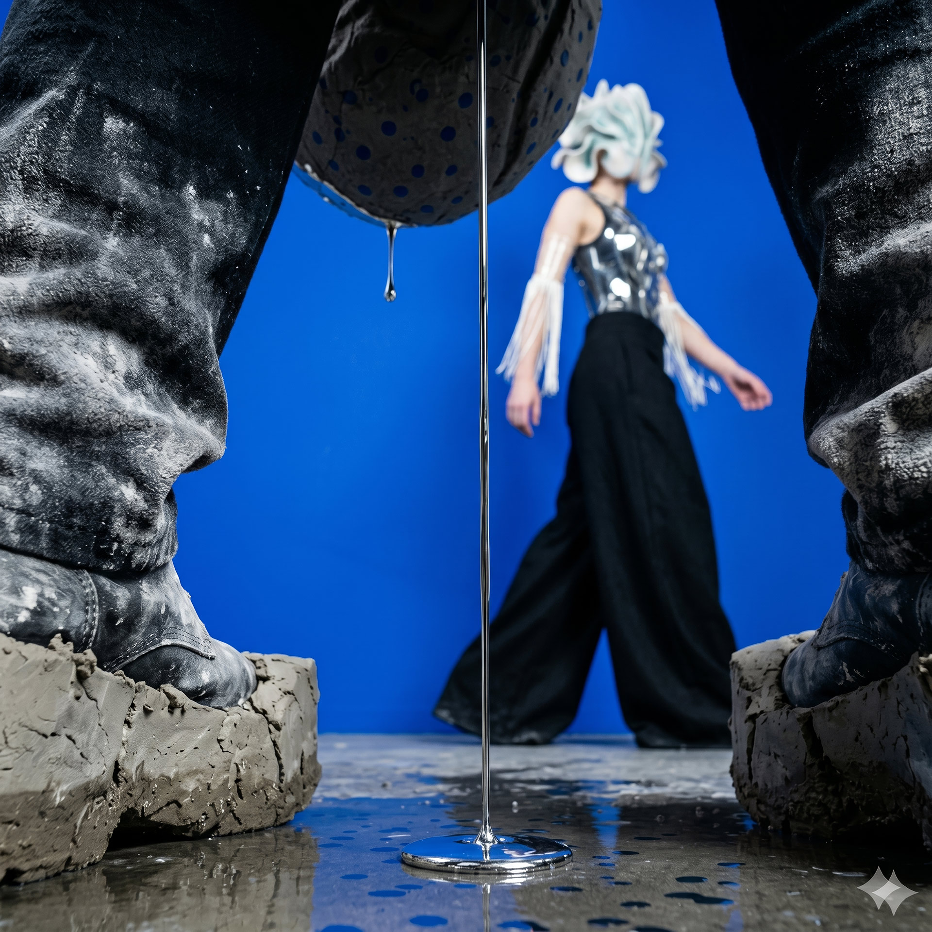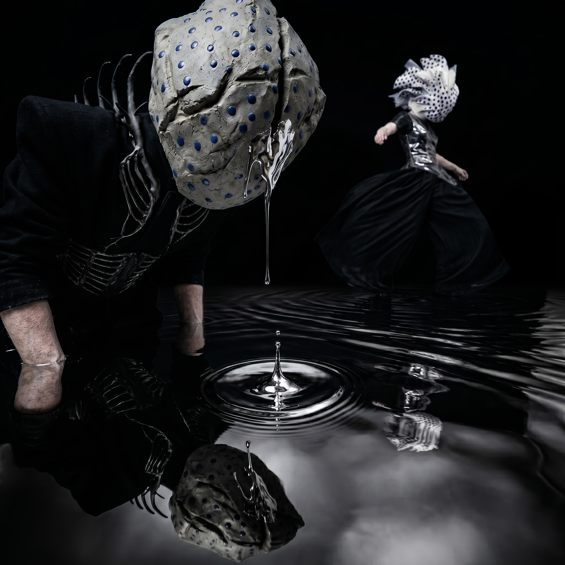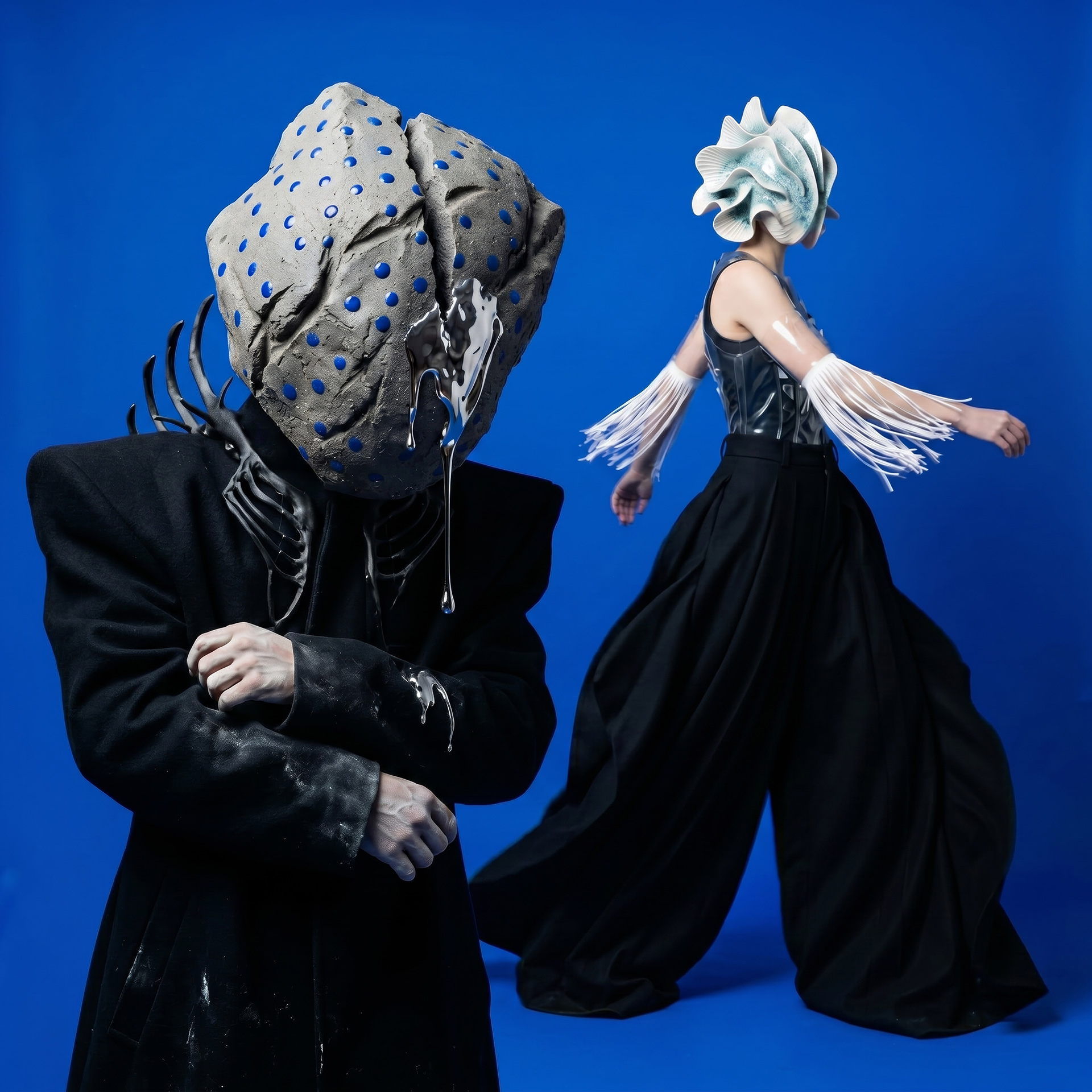 The Shell advances as an architecture of fractured porcelain, an exoskeleton protecting the void. In her shadow, Monolith Boy embodies absolute weight: a stone totem exhaling mercury, leaving a trail of heavy metal across the damp cement.